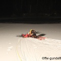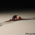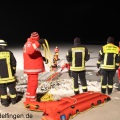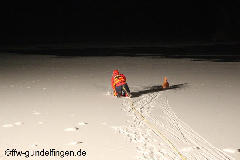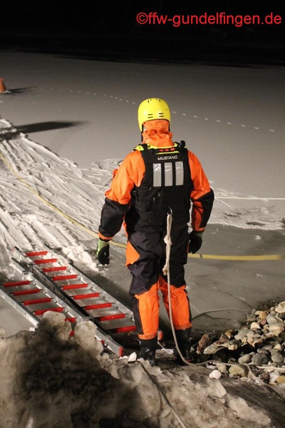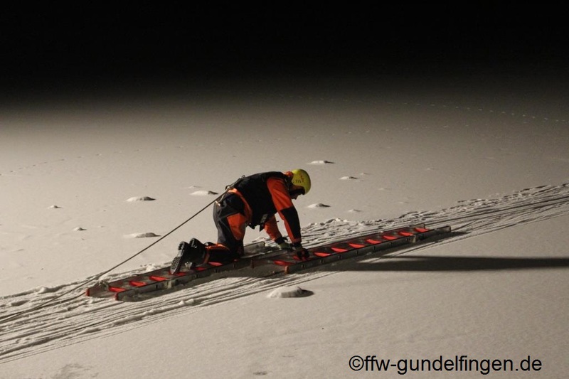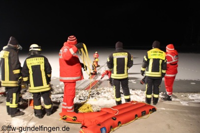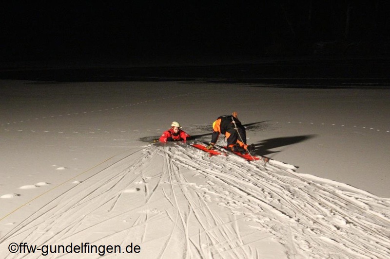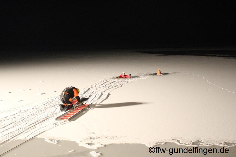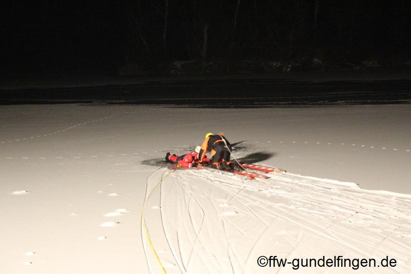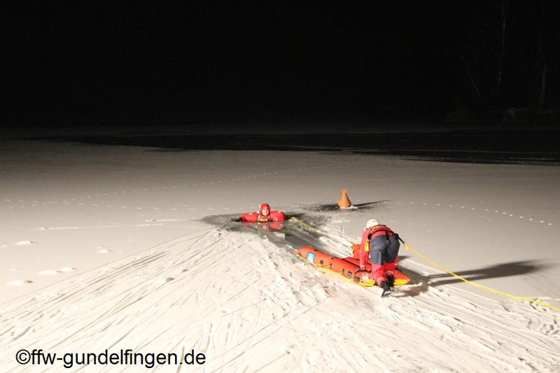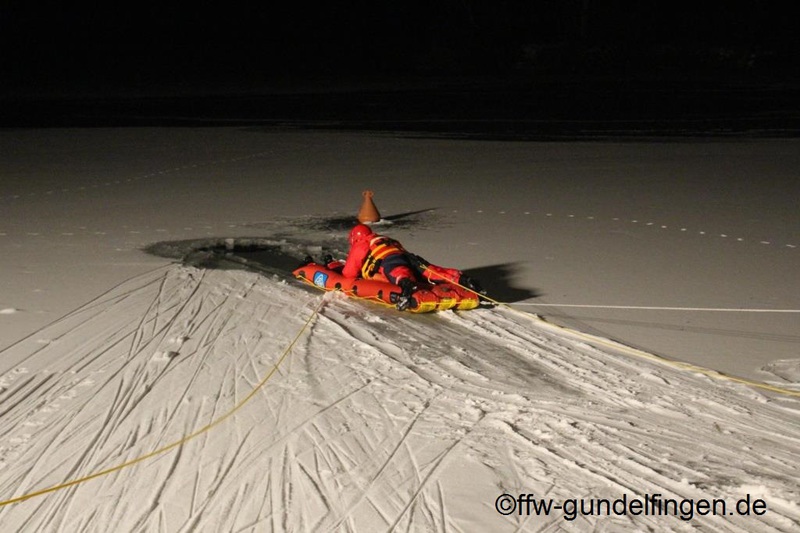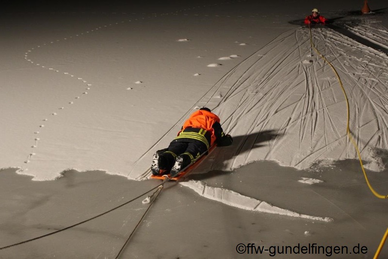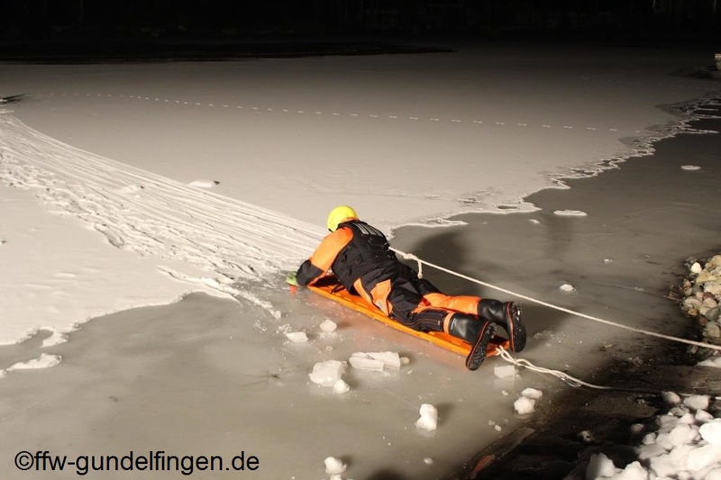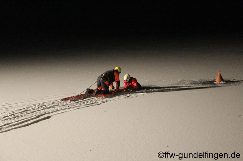 Am vergangenen Freitag führte die Feuerwehr Gundelfingen in Zusammenarbeit mit der SEG Wasserrettung der Wasserwacht Dillingen eine Eisrettungsübung durch. In einem kurzen Theorieteil vermittelten die Ausbilder Florian Grethlein (Feuerwehr Gundelfingen) und Wolfgang Piontek (Wasserwacht Dillingen) alles wissenswerte zu den Themen Alarmierung- und Alarmierungsbeplanung, Besonderheiten von Eisflächen auf Steh- und Fließgewässern, Gefahren bei Eisrettungseinsätzen, medizinische Besonderheiten bei im Eiswasser befindlichen Personen, persönlichen Schutzausrüstung und vor allem dem einsatztaktischen Vorgehen bei eingebrochenen Personen. So wurden auch die Möglichkeiten erörtert, welche unserer Feuerwehr zur Verfügung stehen um in das Eis eingebrochene Personen zu retten. Die sicher schnellsten und einfachsten Methoden sind das Vorgehen mittels Steckleiterteilen um die Körperlast der rettenden Einsatzkraft auf dem Eis möglichst großflächig zu verteilen oder das Vorgehen mittels Spineboard auf welchem sich der Rettende auf das Eis zieht. Um sich selbst bei einem Einbruch in das kalte Wasser zu schützen trägt die rettende Einsatzkraft unseren neuen Überlebensanzug. Dies ist ein spezieller Anzug der den Körper und den Kopf bis auf das Gesicht vollständig umschließt, wasserdicht ist und vor allem einen positiven Auftrieb besitzt. Nach der Theorie folgte die Praxis und ein „Opfer“ der Wasserwacht wurde gut geschützt in ein zuvor erzeugtes Loch im Eis eingesetzt und musste mehrmals gerettet werden.