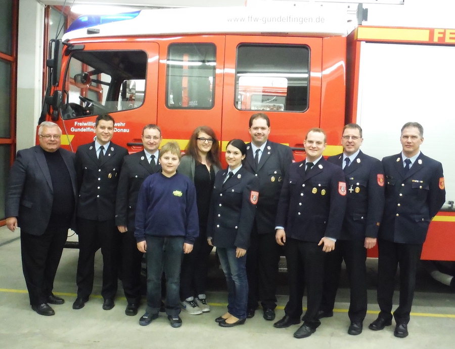 Es folgten die Grußworte von Bürgermeister Franz Kukla und Kreisbrandinspektor Markus Tratzmiller. Sie würdigen in ihren Grußworten das unermüdliche Engagement der aktiven Einsatzkräfte und loben die Verantwortlichen auch für die enormen Leistungen, welche im Hintergrund für ein funktionierendes Einsatz- und Vereinswesen erforderlich ist. Kukla beteuert, dass sich Stadtverwaltung und Stadtrat der Notwendigkeit einer Feuerwehr bewusst sind und dass zur Sicherung der hohen gemeindlichen Qualitäts- und Sicherheitsansprüche entsprechende Feuerwehr-Haushaltsmittel bereitgestellt werden. So befinde sich das erforderliche Drehleiterfahrzeug in „trockenen Tüchern“ und wird spätestens 2016 bei der Gundelfinger Feuerwehr stationiert. Ebenfalls sind die Planungen für den Standort eines neuen Feuerwehrgerätehauses aufgenommen - im Dialog mit den Feuerwehrverantwortlichen werden die Anforderungen an ein zeitgemäßes und zukunftsorientiertes Feuerwehrgerätehaus erfasst um bei dem anstehenden Bauvorhaben alle Voraussetzungen einer funktionierenden, modernen Feuerwehr erfüllen zu können. Kreisbrandinspektor Tratzmiller dankte im Namen der Kreisbrandinspektion für die gute Zusammenarbeit sowie den ganzjährigen Einsatz der Gundelfinger Feuerwehr, welcher gelegentlich auch über die Stadtgrenzen hinaus erforderlich ist. Anschließend überreichte er Stefan Böswald, Nicole Seeßle und Michael Wohlhüter die Besitzurkunde für das erfolgreiche Ablegen aller Prüfungen der Leistungsprüfung „Wasser“.