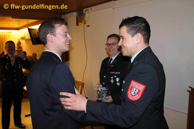 Jugendwart Tony Horsch verliest den Tätigkeitsbericht über die letztjährige Jugendarbeit. Er betont, dass das Engagement der zwischenzeitlich 20 Jugendlichen und deren Übungsbeteiligung besondere Anerkennung verdienen. Für engagierte und zuverlässige Übungsteilnahme wurde Jan Übelhör hervorgehoben. Besondere Erwähnung verdient die Nachwuchswerbung, die, nach einer langen Phase der Vorbereitung, in Zusammenarbeit mit der Stadt Gundelfingen und der Mittelschule Gundelfingen, die erwünschte Resonanz lieferte. Darüber hinaus konnte die Jugendfeuerwehr, aufgrund der erfolgreichen Integration von Jugendlichen mit Migrationshintergrund, mit einem Preis der Raiffeisen – Volksbank Donau Mindel ausgezeichnet werden. Als Highlights erwähnte er den Wissenstest, das alljährliche Zeltlager, die zahlreichen Übungseinsätze sowie den Berufsfeuerwehrtag, bei dem unter anderem eine gemeinsame Einsatzübung mit den umliegenden Jugendfeuerwehren durchgeführt wurde. Abschließend dankte er den beiden Kommandanten, den Maschinisten, allen Helfern sowie dem Gerätewart, die allesamt tatkräftig dazu beitragen konnten, dass die Jugendlichen bestens auf die aktive Feuerwehrtätigkeit vorbereitet werden.
