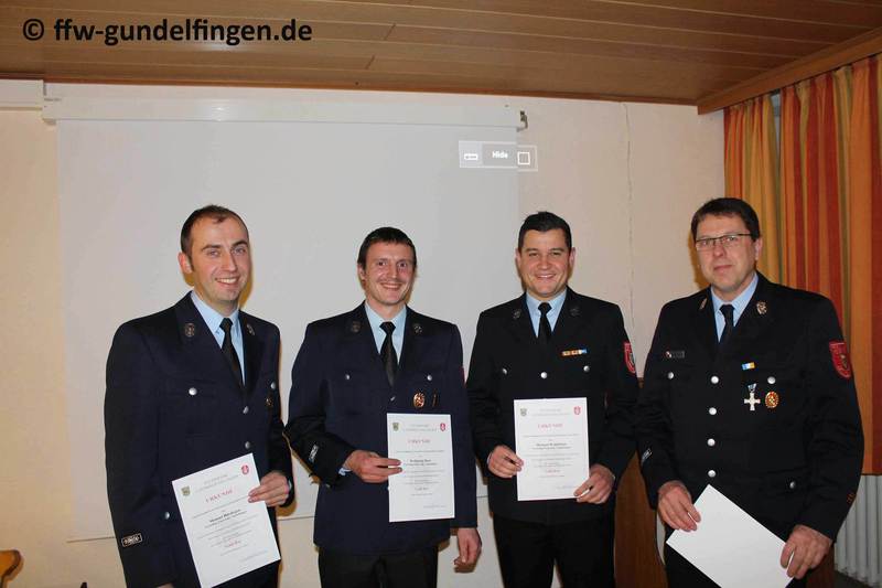 Kreisbrandmeister Klemens Kleiber zeigt sich sichtlich begeistert von der starken Jugendgruppe. In seiner Rede bedankt er sich beim Führungsstab der Gundelfinger Feuerwehr für die ganzjährig gute und freundschaftliche Zusammenarbeit. Zudem sei die Gundelfinger Feuerwehr, als professionell ausgebildete Wehr, auch immer eine gute Adresse bei Schulungs-, Weiterbildungsmaßnahmen und als Ausbildungsort. Die Stadt Gundelfingen sowie auch die gesamte Bevölkerung Gundelfingens kann und muss auf die Mitglieder ihrer Feuerwehr stolz sein. Er dankte auch im Namen der Kreisbrandinspektion für die gute Zusammenarbeit sowie den ganzjährigen Einsatz der Gundelfinger Feuerwehr. Anschließend überreichte er Michael Wohlhüter, Nicole Seeßle, Wolfgang Baur und Manuel Hördegen die Besitzurkunde für das erfolgreiche Ablegen aller Prüfungen der Leistungsprüfung „Technische Hilfeleistung“ und dankt auch der Stadt Gundelfingen für die Bereitstellung der finanziellen Mittel und bei allen Kameraden der Gundelfinger Feuerwehr für das tolle Miteinander. Er wünscht weiterhin eine erfolgreiche Jugendarbeit, die auch als Aushängeschild im Landkreis Dillingen gesehen werden darf, sowie deren hoffentlich zahlreichen Übertritt in die aktive Wehr. Abschließend gilt sein besonderer Dank dem langjährigen Kommandanten Michael Hirsch, mit dessen Amtszeit auch eine Ära endet, in der er sich durch vielfältiges Aufgabengebiet Respekt und Anerkennung verdient hat.