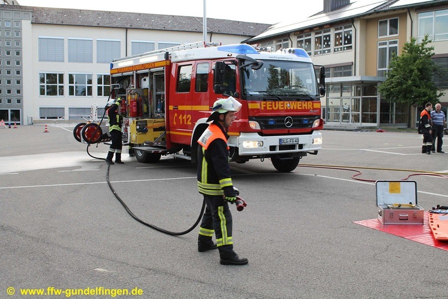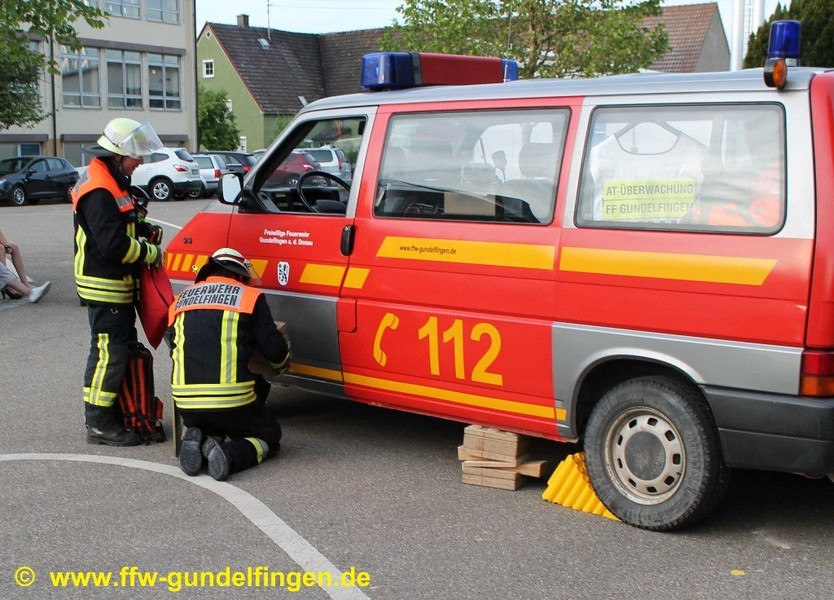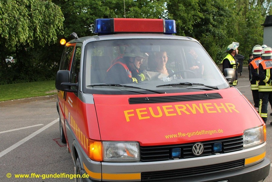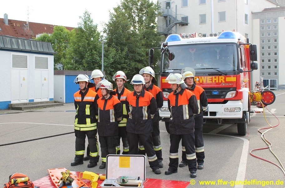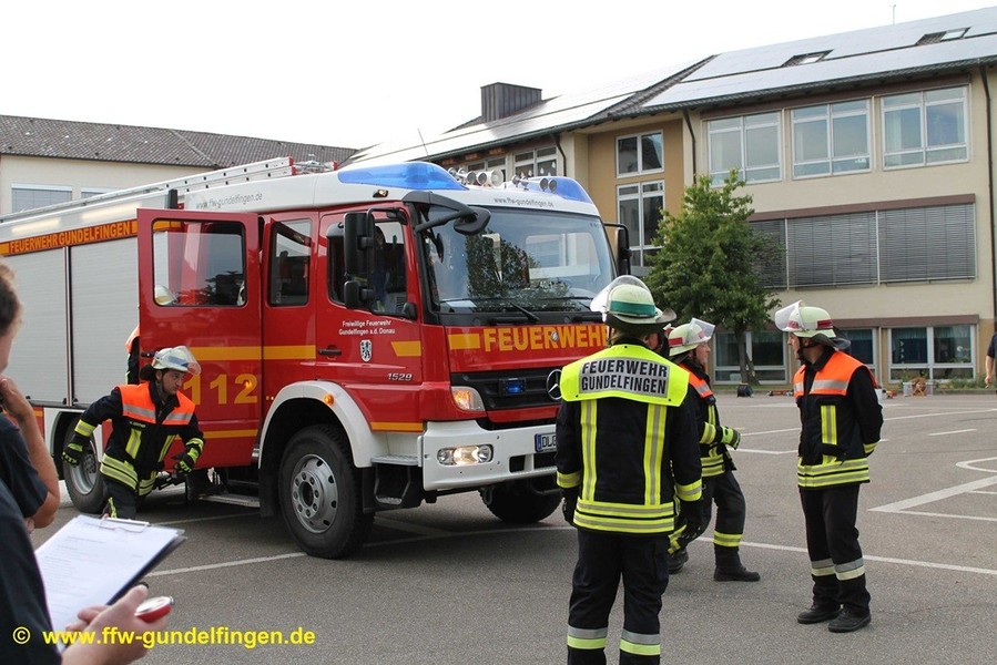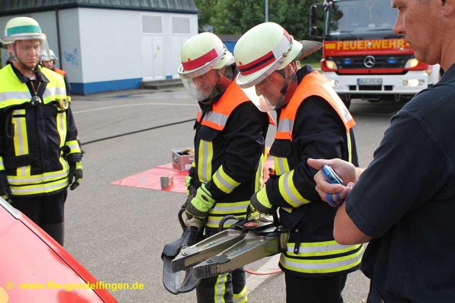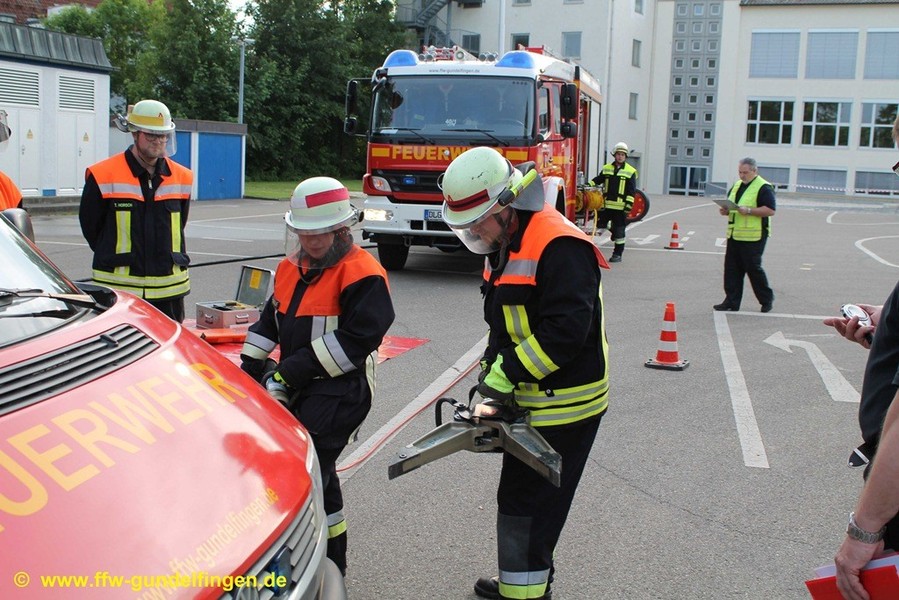 Bei der Leistungsprüfung „Technische Hilfeleistung“ mussten die Gundelfinger Floriansjünger Fertigkeiten nachweisen, welche auch für einen realen THL-Einsatz erforderlich sind. In das Prüfungsergebnis flossen Kriterien ein wie umfangreiche Kenntnisse über die im Fahrzeug mitgeführten Gerätschaften, korrekte Kommunikation bei der Befehlsübergabe, richtiger Umgang mit den Geräten und Werkzeugen, perfektes Zusammenspiel der einzelnen Tätigkeiten innerhalb der Gruppe sowie zügiges und sauberes Arbeiten mit den erforderlichen Hilfeleistungsgeräten. Beim praktischen Prüfungsvortrag wird die Einsatzlage eines Verkehrsunfalls mit eingeklemmter Person dargestellt. Um die Person befreien zu können, müssen zunächst hydraulischer Rettungsspreizer und Schneidgerät einsatzbereit zum angenommen Unfallobjekt gebracht werden. Eine Verkehrsabsicherung muss erstellt und zur Sicherung gegen Brandgefahren ist der Schnellangriffsschlauch des Löschfahrzeuges in Bereitstellung zu bringen. Durch den Maschinisten des Feuerwehrfahrzeuges muss der Stromerzeuger rechtzeitig in Betrieb genommen werden, damit die Einsatzstelle mit Flutlichtstrahler ausgeleuchtet und das Hydraulikaggregat betrieben werden kann. Die aus jeweils neun Kameraden bestehende Gruppe hat den Aufbau in weniger als drei Minuten möglichst fehlerfrei durchzuführen, was den drei Gruppen der Freiwilligen Feuerwehr Gundelfingen mit Bravour gelang.