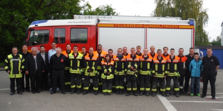 Kreisbrandinspektor Tratzmiller überreichte die Leistungsabzeichen an Monique Baumgärtner, Stefan Pallor, Simon Ritter, Martin Winkler (alle Bronze, Stufe 1), Sven Brandwein, Maximilian Hirsch, Tobias Tuschke, Daniel Wudy (alle Silber, Stufe2), Markus Gärtner (Gold, Stufe 3), Florian Grethlein, Uwe Hartshauser (alle Gold-Blau, Stufe 4), Michael Dölle, Christian Mozet (beide Gold-Grün, Stufe 5), Wolfgang Baur, Manuel Hördegen, Nicole Seeßle, Michael Wohlhüter (alle Gold-Rot, Stufe 6). Nach den Anstrengungen der Leistungsprüfungen wurde zum gemütlichen Beisammensein ins Gundelfinger Gerätehaus geladen. Das Bild zeigt die Mitglieder der Feuerwehr Gundelfingen um Kommandant Michael Hirsch sowie Bürgermeister Franz Kukla und das Schiedsrichterteam der Kreisbrandinspektion Dillingen um Kreisbrandinspektor Markus Tratzmiller.