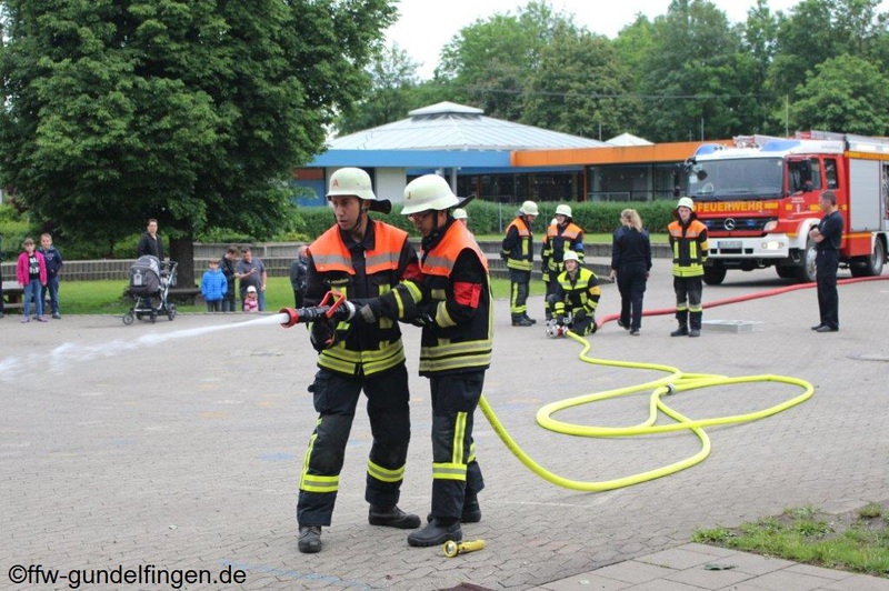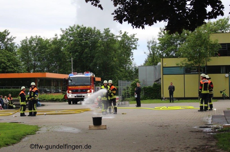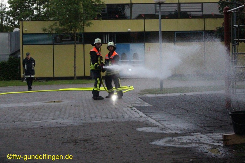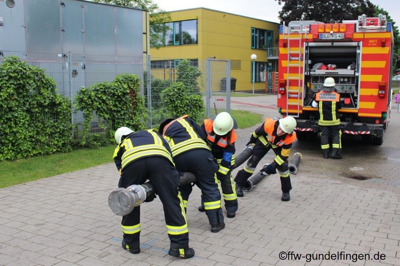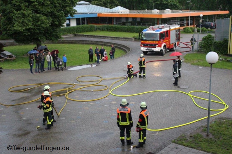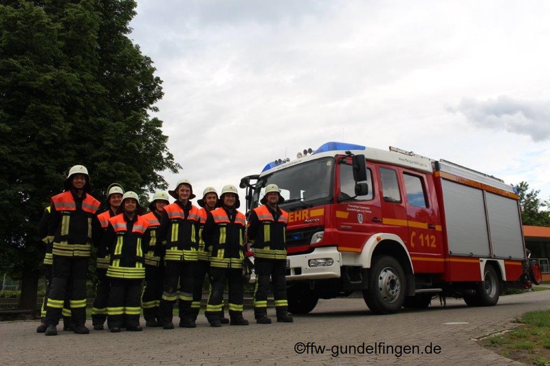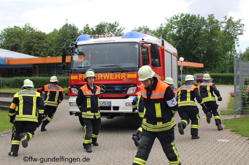 „Brand eines Nebengebäudes – keine Menschen und Tiere in Gefahr“ lautete der Einsatzbefehl für die Löschgruppen, ehe sie den Oberflurhydranten in Betrieb nehmen, den Verteiler setzten und nach und nach drei Strahlrohe vornehmen konnten. Im Rahmen der Leistungsprüfung „Die Gruppe im Löscheinsatz“ in der Variante 1 „Außenangriff – Wasserentnahme aus Hydranten“ wird der korrekte Umgang mit Strahlrohren, der Aufbau einer Wasserversorgung sowie die Absicherung der Einsatzstelle geprüft. Das Kuppeln einer Saugleitung sowie die Kenntnis und Beherrschung verschiedener Knoten wird ebenfalls von den teilnehmenden Feuerwehrleuten verlangt. Beide Gundelfinger Löschgruppen arbeiteten sorgfältig und innerhalb der vorgegebenen Sollzeit, so dass im Anschluss die Leistungsabzeichen aus den Händen der Schiedsrichter entgegengenommen werden konnten. Einen besonderen Dank sprach Kommandant Michael Wohlhüter den Teilnehmern der Leistungsprüfung für ihr Engagement während der vorbereitenden Übungen unter der Leitung von stv. Kommandant Florian Grethlein und Gruppenführer Tony Horsch aus. Auch Ordnungsamtsleiter Herr Mayr stellvertretend für die Stadt Gundelfingen, zeigte sich vollauf zufrieden, lobte die saubere Arbeit und dankte allen Aktiven für ihren Einsatz.