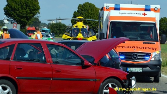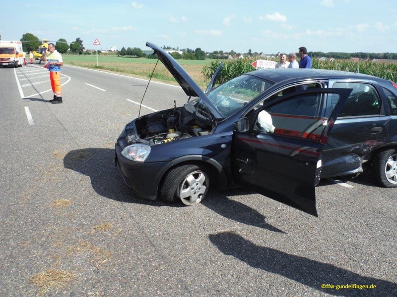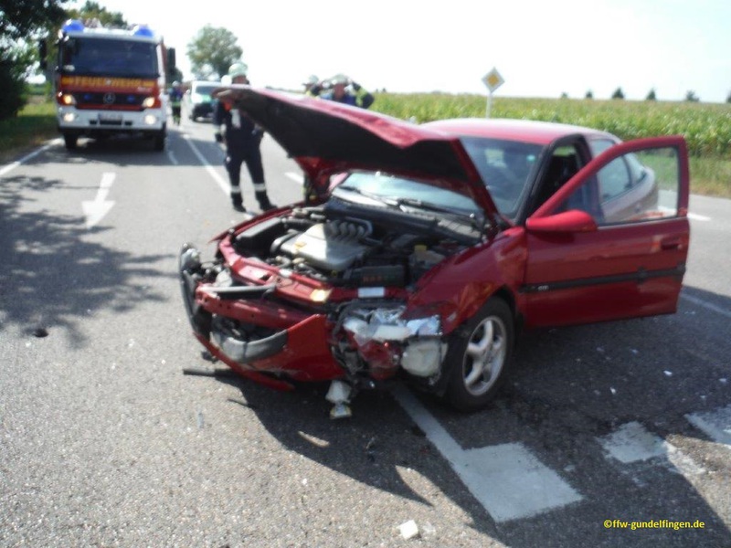 Beim Eintreffen der Feuerwehr Gundelfingen war die Polizei und der Rettungsdienst bereits vor Ort. Die beiden Unfallfahrzeuge standen mitten auf der