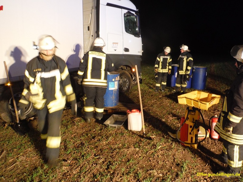 Erkundung durch den Einsatzleiter der Feuerwehr waren größere Dieselpfützen im Feld feststellbar. Die Leckage im Fahrzeugtank war zunächst nicht zugänglich. Die Feuerwehr hat die Absicherung der
