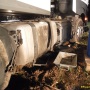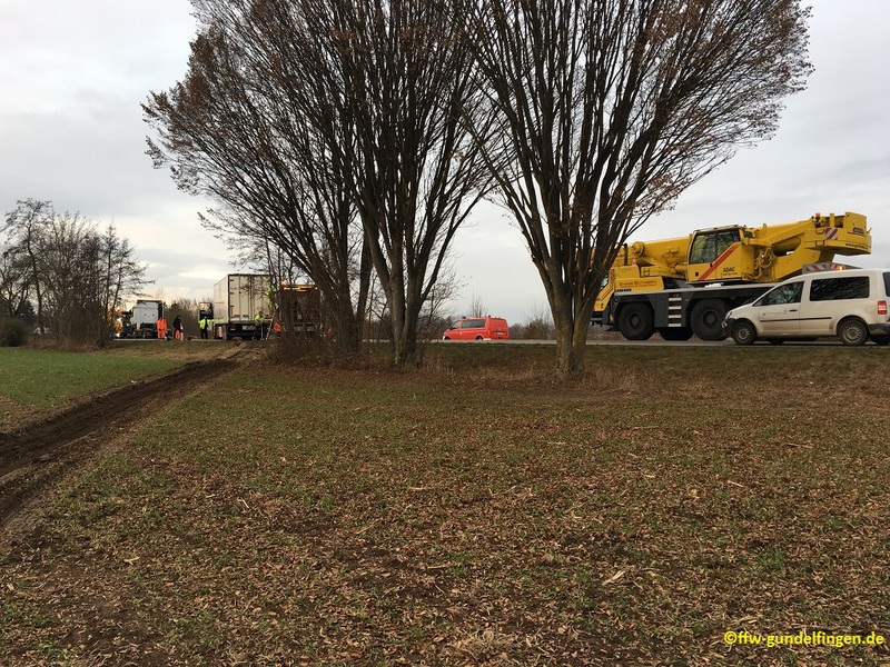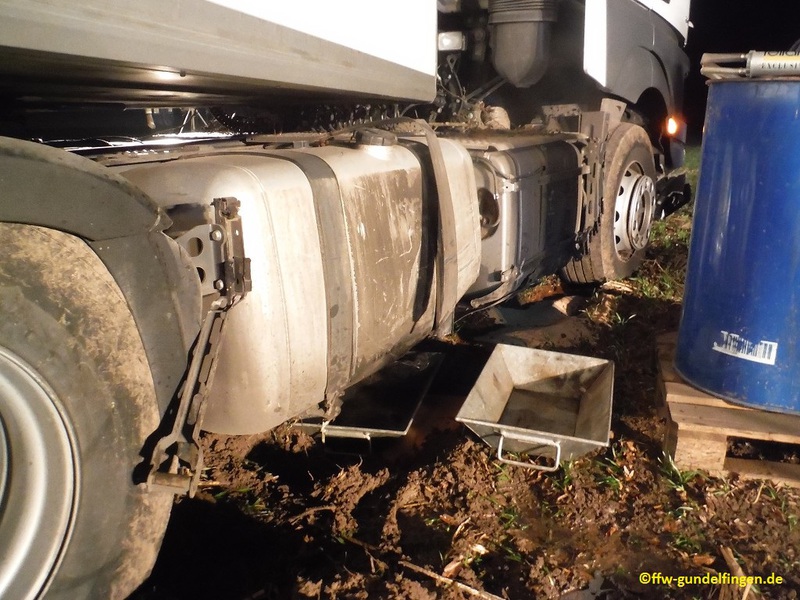 die Leckage im Fahrzeugtank zugänglich gemacht. Der Kraftstoff aus dem defekten Fahrzeugtank wurde durch die Feuerwehr in Fässer umgepumpt. Zur Bergung des Sattelzuges kam ein Mobilkran zum Einsatz.