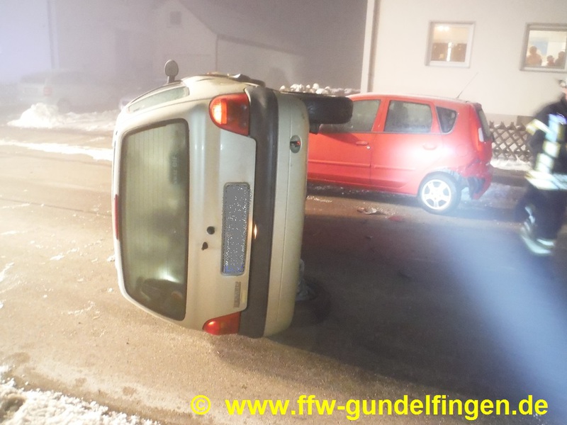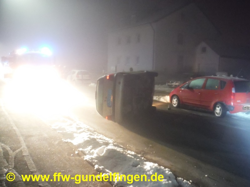 Bei einem Verkehrsunfall auf der Wilhelm-Hauff-Straße in Gundelfingen ist am Mittwochmorgen, 20.01.2016 ein 26-jähriger PKW-Lenker leicht verletzt worden. Nach ersten Feststellungen der Polizei war der 26-Jährige mit nicht angepasster Geschwindigkeit unterwegs und kam in einer Rechtskurve nach rechts von der Fahrbahn ab und fuhr auf ein, am Fahrbahnrand ordnungsgemäß abgestelltes, Fahrzeug auf. Um einen Auffahrunfall zu vermeiden, versuchte er noch vergeblich sein Fahrzeug nach links zu ziehen, wodurch es ins Schleudern geriet und nach dem Aufprall auf das geparkte Fahrzeug auf die Fahrerseite kippte und liegen blieb. Der Unfallverursacher konnte sich aus eigener Kraft aus dem Fahrzeug befreien. Unsere Feuerwehr wurde um 06:15 Uhr zu dem Unfall alarmiert. Wir fuhren mit vier Fahrzeugen, dem Verkehrssicherungsanhänger VSA und 22 Einsatzkräften die Einsatzstelle an. Bis zum Eintreffen des Rettungsdienstes unterstützen wir bei der Verletztenbetreuung. Des Weiteren sicherten wir die Unfallstelle ab, richteten eine Straßensperrung samt Verkehrsumleitung ein, leuchteten mit Fahrzeuglichtmast unseres HLF aus, unterstützten bei der Unfallaufnahme sowie bei der Räumung des Verkehrsweges. Mit Stoßbesen reinigten wir die verschmutzte Fahrbahn. Abschleppwagen sorgten für den Abtransport der nicht mehr fahrbereiten Unfallfahrzeuge. Der verletzte Autolenker wurde zur weiteren ärztlichen Versorgung ins Krankenhaus Dillingen gebracht. Gegen ca. 07:15 Uhr waren wir wieder einsatzbereit am Gerätehaus zurück. Lt. Pressemeldung der Polizei beträgt der an den Fahrzeugen entstandene Sachschaden ca. EUR 3.000,--. (FFG-him)