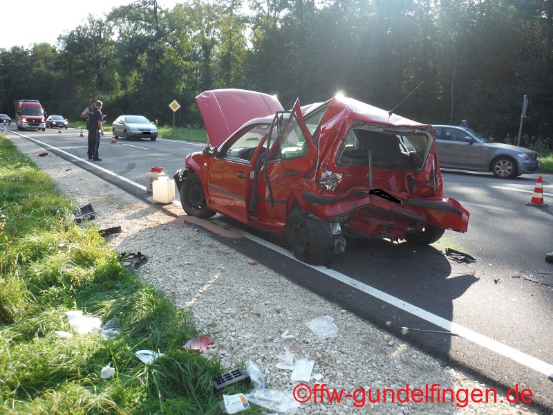 Die Feuerwehr aus Gundelfingen wurde am heutigen Montagnachmittag zu einem Verkehrsunfall auf die B16 Höhe dem Parkplatz Birkenried alarmiert. Laut Polizei musste ein 27-jähriger Kleinlastwagenfahrer so heftig niesen, dass er einen Unfall auslöste. Der Mann war gegen 16:30 Uhr mit einem Transporter auf der B16 aus Richtung Günzburg nach Gundelfingen unterwegs. Auf Höhe der Abzweigung Birkenried musste der Fahrer so kräftig niesen, dass er er einen vor ihm verkehrsbedingt bremsenden 49-jährigen Verkehrsteilnehmer übersah und auf diesen auffuhr. Dieser wurde wiederrum auf einen ebenfalls bremsenden PKW geschoben. Ein Fahrer erlitt bei dem Aufprall Verletzungen am Brustkorb und muss im Krankenhaus Günzburg behandelt werden, der Unfallverursacher und der 40-jährige Fahrer des anderenb PKW wurden mit leichten Verletzungen an Hand und Kopf ins Krankenhaus Dillingen verbracht. Die beteiligten Fahrzeuge wurden teils erheblich beschädigt und mussten mittels Abschlepper abtransportiert werden. Es entstand ein Gesamtschaden von ca. 17.000 Euro. Die eintreffenden Kräfte der Feuerwehr übernahm die Absicherung der Einsatzstelle und das Auffangen und Abbinden auslaufender Betriebsstoffe (2 Fahrzeuge). Für die Rettungs- und Aufräummaßnahmen musste die B16 von der Feuerwehr im betroffenen Abschnitt komplett gesperrt und der Verkehr umgeleitet werden.