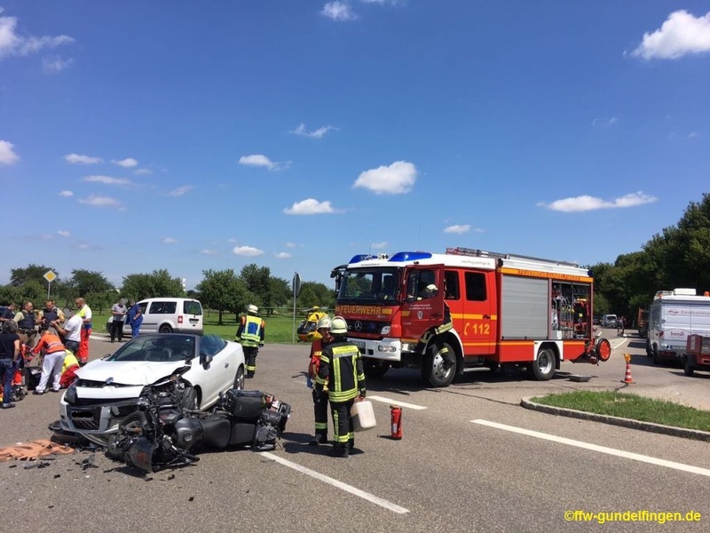 Die Feuerwehr Gundelfingen wurde am heutigen frühen Donnerstag-Nachmittag zu einem Verkehrsunfall mit einem PKW und Motorrad auf die B16 Anschlussstelle Gundelfingen Süd gerufen.