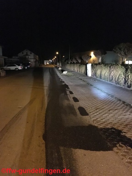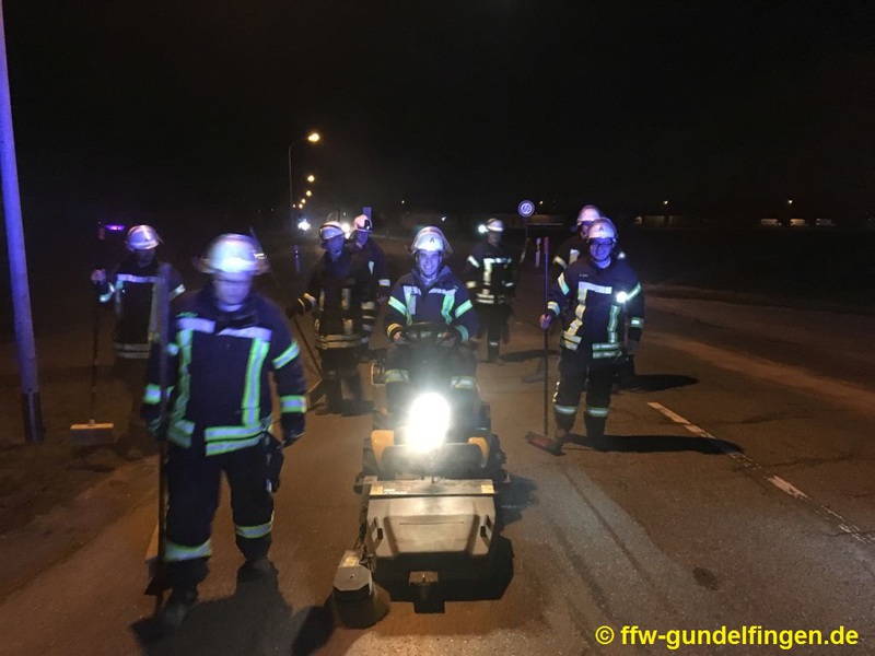 Noch während des Rettungskorbeinsatzes in Oberbechingen wurde die Feuerwehr Gundelfingen über Funk von der ILS Augsburg über eine Ölspur im Bereich Industriestraße - Günzburger Straße informiert. Zusammen mit einer Steife der Polizei wurde das Ausmaß der Ölspur erkundet und die weiteren Maßnahmen abgestimmt. Es erfolgte daraufhin die Verständigung des Straßenbaulastträgers sowie die Alarmierung der Feuerwehr. Ein Verursacher konnte zunächst nicht festgestellt werden. Die Feuerwehr Gundelfingen hat die Ölspur mit Vielzweckbinder abgestreut.