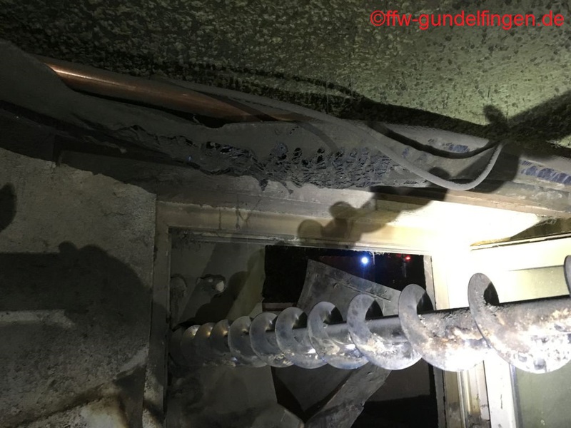 Unverzüglich wurde ein Löschangriff vorbereitet und eine Wasserversorgung erstellt. Die Erkundung durch den ersten Angriffstrupp des HLF´s ergab einen Brand im Bereich einer Hackschnitzelanlage der jedoch aufgrund der örtlichen Gegebenheiten von der Feuerwehr zunächst nicht erreichbar war. Nach Rücksprache mit dem Eigentümer konnte in Erfahrung gebracht werden, dass es sich um eine Strohhackschnitzelanlage handelte. Der Lagerbunker war randvoll befüllt mit Hackschnitzel. Zusätzlich waren den Hackschnitzeln ein Brandkalk beigemischt, so dass ein Löschen mit Wasser nicht möglich war. Zur Brandbekämpfung musste der Bunker von der Feuerwehr durch den Einsatz einer Rettungssäge geöffnet und komplett geräumt werden. Hierzu waren mehrere Atemschutztrupps im Einsatz. Zum Leeren des Bunkers wurde eine Fachfirma an die Einsatzstelle geordert, die das Brandgut aus dem Bunker saugen konnte. Die Hackschnitzel wurden auf ein nahegelegenes Feld gebracht. Nachdem der Lagerbunker geräumt war, konnte die Brandbekämpfung im Bereich der Förderschnecke durch den Einsatz mehrer CO2-Löscher fortgesetzt werden. Hierzu mussten erneute Teile der Anlage demontiert werden. Zur Unterstützung der Feuerwehren wurde die Feuerwehr aus Haunsheim mit weiteren Atemschutzgeräteträgern alarmiert.