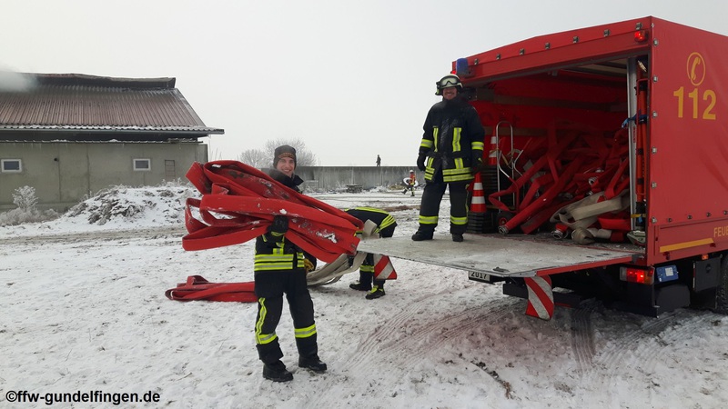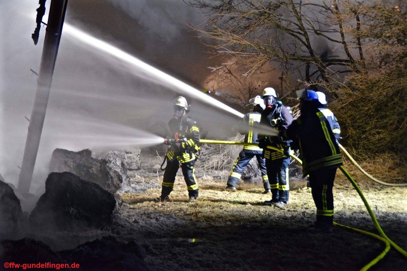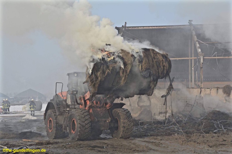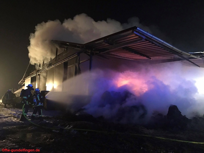 Die Erkundung ergab einen Brand einer Maschinenhalle sowie den Brand eines Stohballenlagers mit angeschlossenem Stall. Es befanden sich zu diesem Zeitpunkt noch knapp 20 Rinder in der brennenden Halle. Aufgrund der ausgedehnten Lage wurde zeitnah, die aus dem benachbarten Baden-Württemberg stammende Feuerwehr Sontheim nachalarmiert. Die Tiere konnten von der Feuerwehr noch rechtzeitig in Sicherheit gebracht werden. Die Wasserversorgung an der Einsatzstelle war sehr schlecht. Es mussten hunderte Meter lange Schlauchleitungen ins Dorf bzw. zu einem entfernt gelegenen Brunnen von den Einsatzkräften verlegt werden. Die kalten Temperaturen von bis zu -17 Grad machten den Einsatzkräften und den Gerätschaften zu schaffen. Zur Brandbekämpfung waren mehrere C-Rohre und Atemschutztrupps sowie die Drehleiter im Einsatz. Das Einsatzleitfahrzeug aus Gundelfingen unterstütze den Einsatzleiter und übernahm die zentrale Kommunikation an der Einsatzstelle. Die Einsatzstelle wurde in zwei Einsatzabschnitte unterteilt. Im weiteren Einsatzverlauf wurde die WF der BSH Hausgeräte GmbH aus Dillingen mit dem Großlüfter Fahrzeug, das THW, der Gerätewagen Atemschutz der Feuerwehr Heidenheim und die Betreuung des BRK zur Einsatzstelle alarmiert.