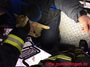 die Katze, als sie von der Feuerwehr mit der Drehleiter aus ihrer misslichen Lage befreit wurde und ihren Besitzern übergeben werden konnte.