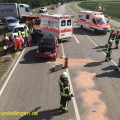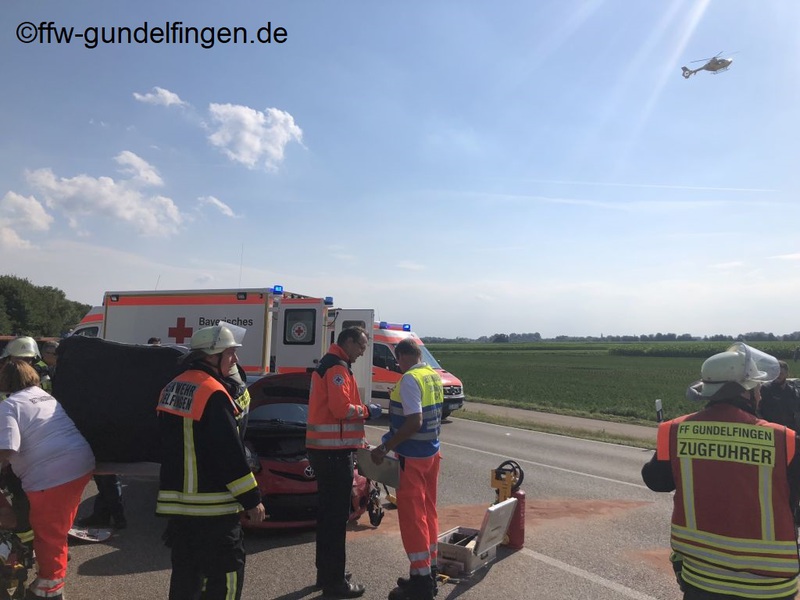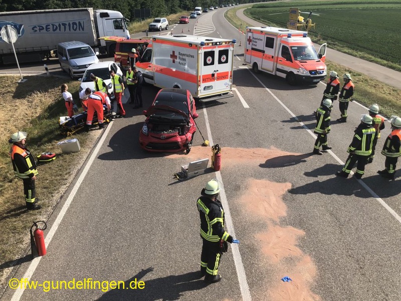 Beim Eintreffen der Feuerwehr waren keinen Personen in den Fahrzeugen eingeklemmt. Die Feuerwehr hat die Erstversorgung der Verunfallten bis zum Eintreffen des Rettungsdienstes und die Absicherung der Einsatzstelle übernommen. Der Verkehr wurde großräumig um die Umfallstelle geleitet. Die beiden verletzten Personen wurden mit Rettungswagen in umliegende Kliniken gebracht. Der ebenfalls an der Einsatzstelle gelandete Rettungshubschrauber Christoph 40 aus Augsburg kam nicht mehr zum Einsatz. Nach den Aufräumarbeiten wurden von der Feuerwehr ausgelaufene Betriebsstoffe aufgenommen und die Einsatzstelle anschließend an die Polizei übergeben.
