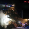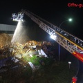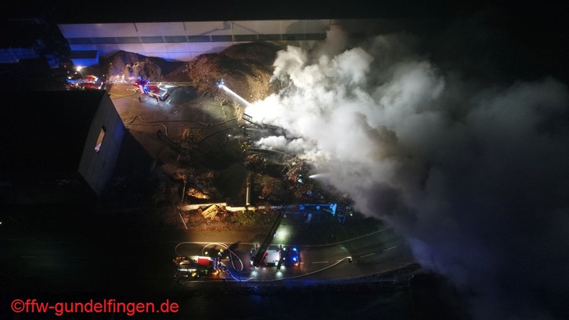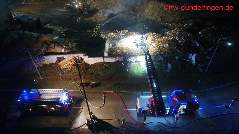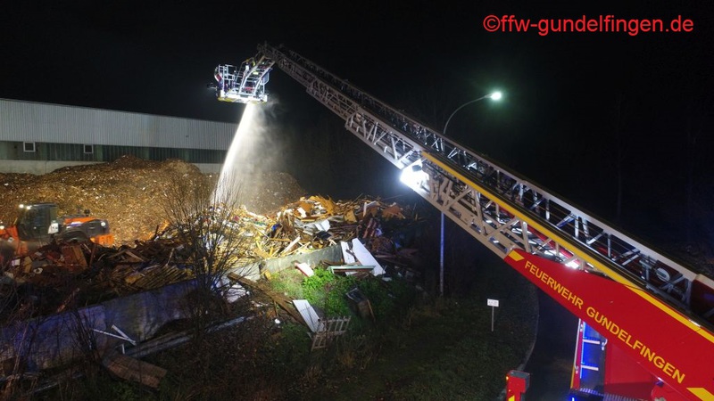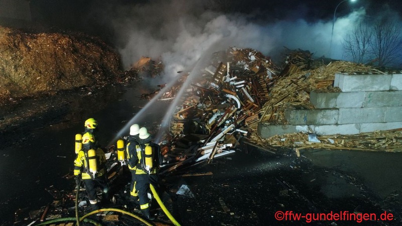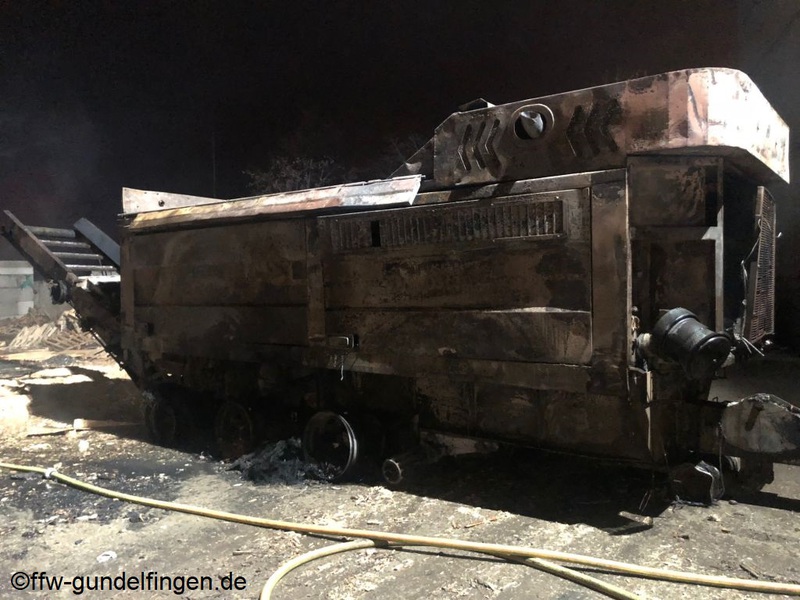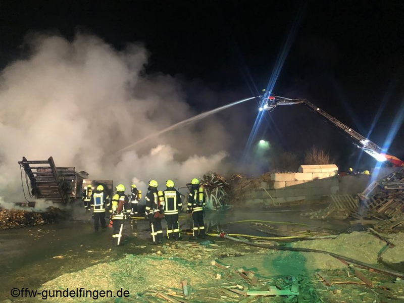 Bereits auf der Anfahrt von Richtung Gundelfingen war der helle Feuerschein am Nachthimmel deutlich zu erkennen. Aus bislang ungeklärter Ursache war ein großer Hackschnitzelhaufen sowie eine abgestellte Häckselmaschine in Brand geraten. Beim Eintreffen der Feuerwehr Gundelfingen hatte die kurze Zeit vorher alarmierte Feuerwehr Sontheim bereits mit der Brandbekämpfung begonnen. Zur Brandbekämpfung waren neben den beiden Drehleitern aus Gundelfingen und Giengen mehre Atemschutztrupps mit C- und B- Leitungen im Einsatz.
