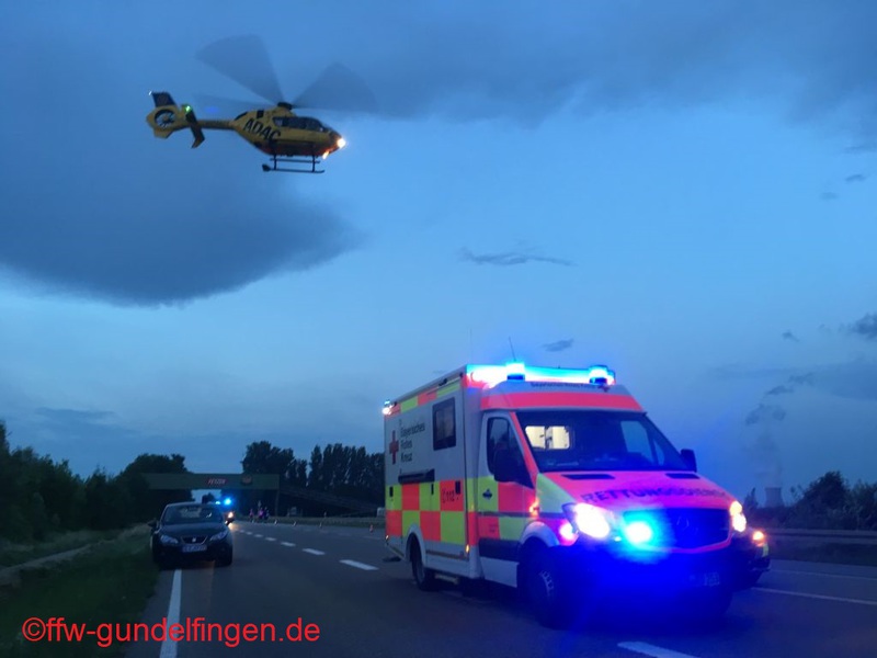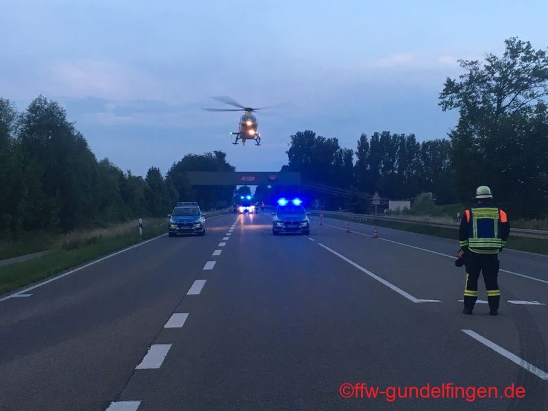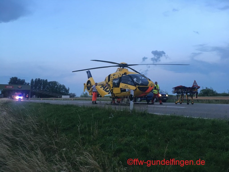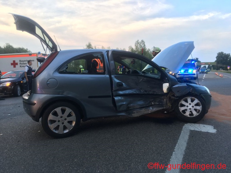 Die Feuerwehr aus Gundelfingen wurden am heutigen Samstag zu einem Verkehrsunfall mit zwei PKW und zwei verletzten Personen gerufen.Beim Abbiegevorgang kollidierten zwei PKW miteinander, einer davon landetet in Folge des Zusammenstoßes im Graben. Beim Eintreffen der Feuerwehren waren die beiden verletzten Personen bereits aus dem Fahrzeug befreit. Die Feuerwehr übernahm die Absicherung der Einsatzstelle gegen Brandgefahr und fließenden Verkehr sowie die Aufnahme auslaufender Betriebsstoffe. In Folge dessen wurde eine einseitige Verkehrsregelung errichtet, bis der Verkehr durch Kräfte der freiwilligen Feuerwehr Gundelfingen großräumig umgeleitet werden konnte. Aufgrund der schwere der Verletzungen eines Unfallbeteiligten landete ein Rettungshubschrauber an der Einsatzstelle, dessen Landung die Einsatzkräfte aus Gundelfingen absicherten.