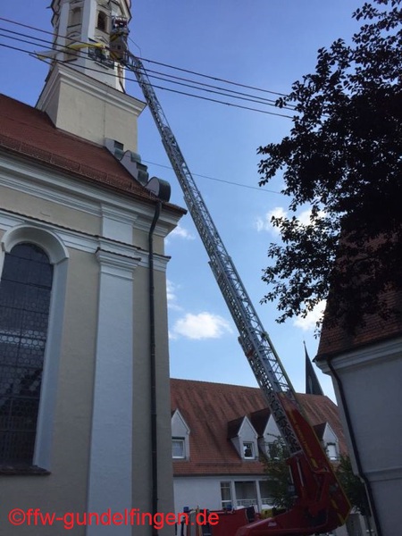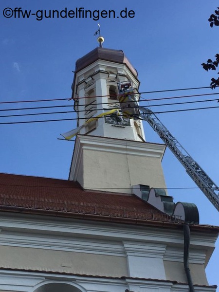 Am Freitagnachmittag wurde die Feuerwehr Gundelfingen mit der Drehleiter zur Spitalkirche gerufen. Dort hatte sich eine Fahne um die