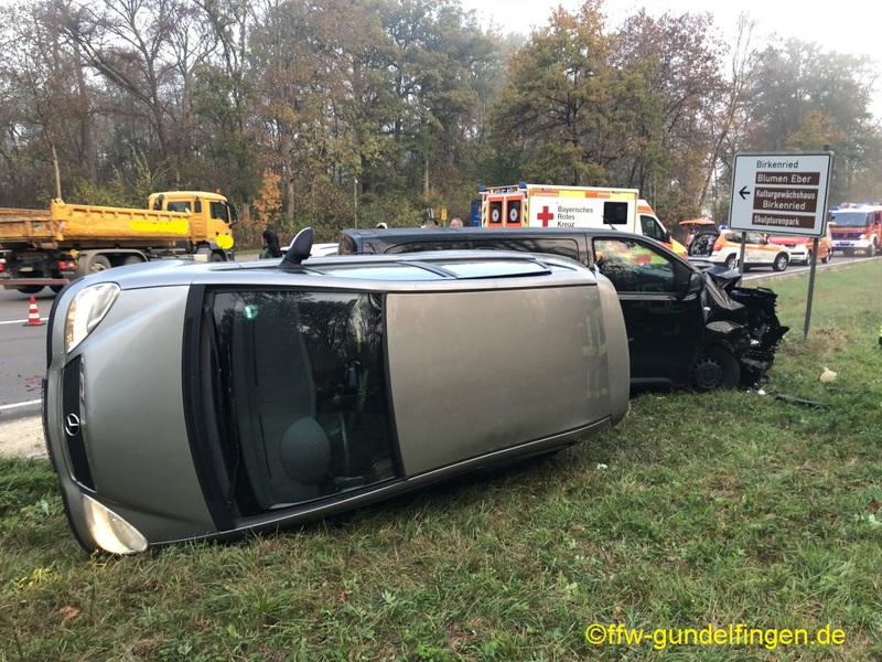 der Seite zum Liegen kam. Bei dem Zusammenstoß wurde eine Person schwer und vier weitere Personen leicht verletzt. Die Feuerwehren