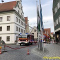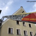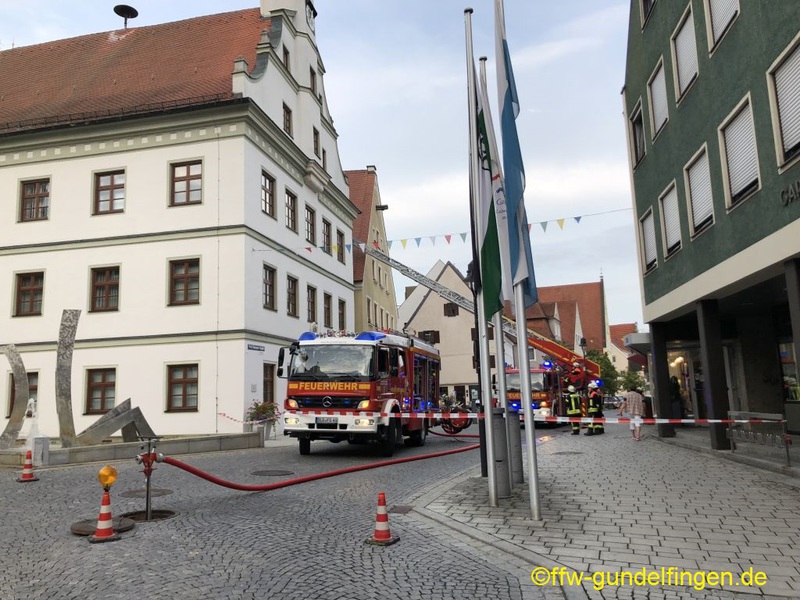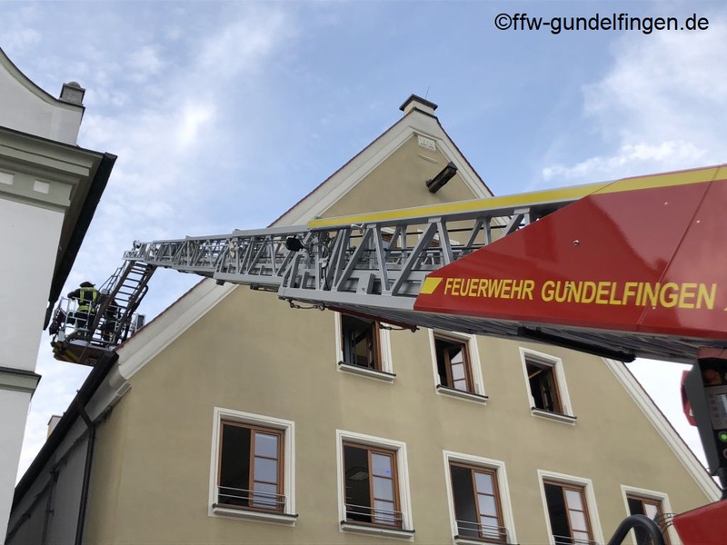 Das Bauamt der Stadt Gundelfingen hat die Feuerwehr um Hilfe gebeten. Ein Dachrinneneinlauftopf am Rathaus war verstopf. Das Spülen der Dachrinne von einer Revisionsöffnung aus brachte nicht den gewünschten Erfolgt. Da sich der Dachrinneneinlauf zwischen zwei Gebäuden befand, war er nur schwer zu erreichen. Mit der Drehleiter und dem Einsatz des Gelenkes war es der Feuerwehr möglich den Topf zu begutachten. Der gesamte Dachrinneneinlauftopf war verstopft mit Geästen vom Storchennest auf dem Rathausdach. Der Topf wurde von der Feuerwehr von den Verunreinigungen befreit und die Dachrinne anschließend vom Drehleiterkorb aus durchgespült.