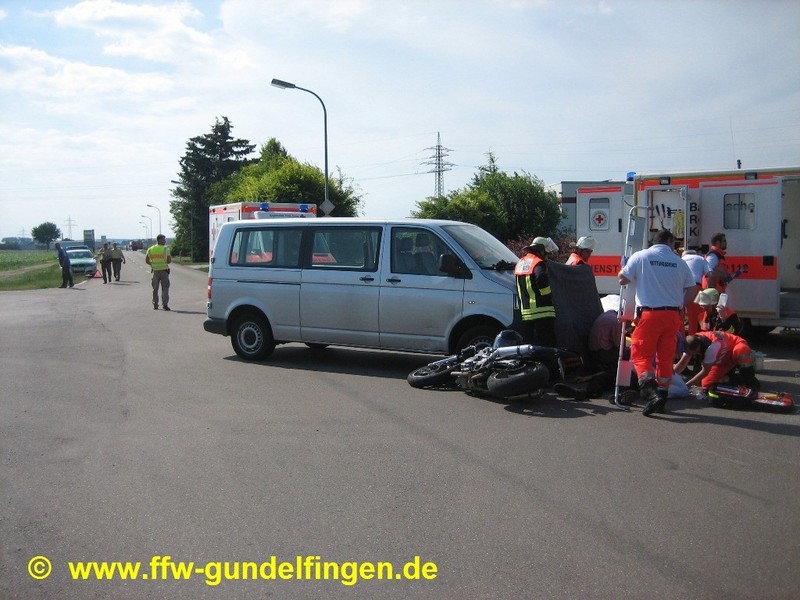 Unser Freiwillige Feuerwehr Gundelfingen wurde um 16.37 Uhr ebenfalls zur Unfallstelle gerufen, da zunächst davon ausgegangen wurde, dass der Motorradfahrer unter dem VW-Bus eingeklemmt wurde. Für die Rettungsarbeiten sowie zur Unfallaufnahme musste die Industriestraße im Bereich der Unfallstelle kurzzeitig komplett gesperrt werden. Unsere FF Gundelfingen übernahm hierfür die verkehrslenkenden Maßnahmen. Gegen ca. 17.45 Uhr waren unser Einsatzkräfte einsatzbereit im Gerätehaus zurück.