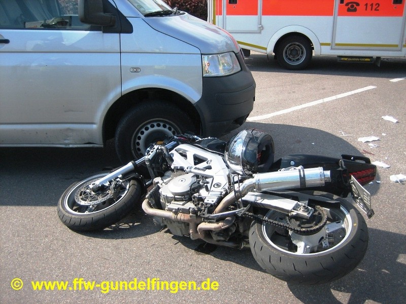 Ein 52-jähriger Kombi-Fahrer hat am Dienstagnachmittag, 09.07.2013 gegen ca. 16.30 Uhr beim Linksabbiegen auf der Industriestraße einen entgegenkommenden Motorradfahrer übersehen. Der 27-Jährige reagierte und versuchte, sein Motorrad abzubremsen – hierbei stürzte er auf die rechte Seite und schlitterte samt Motorrad unter den VW-Transporter. Der BRK-Rettungsdienst brachte den verletzten Motorradfahrer zur Behandlung in die Günzburger Kreisklinik. Lt. Polizeibericht erlitt er einen Beckenbruch und Schleudertrauma - der unfallverursachende Kombi-Fahrer erlitt einen leichten Schock. Beim Unfall entstand nach Polizeiangaben ein Sachschaden in Höhe von rund 8.000 Euro.