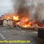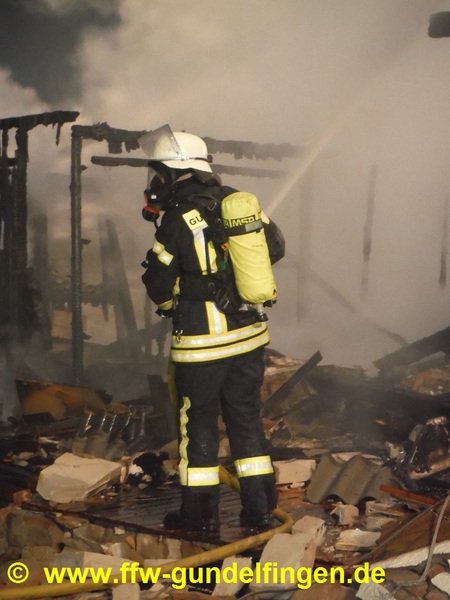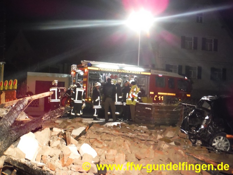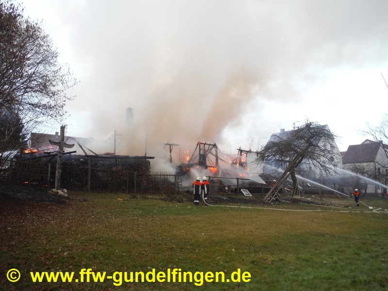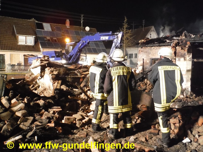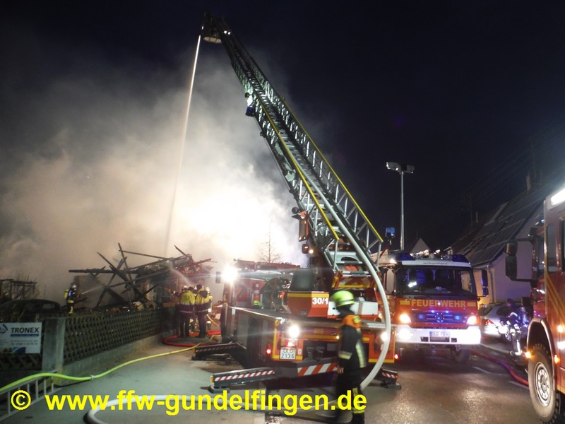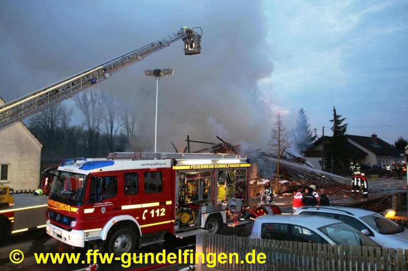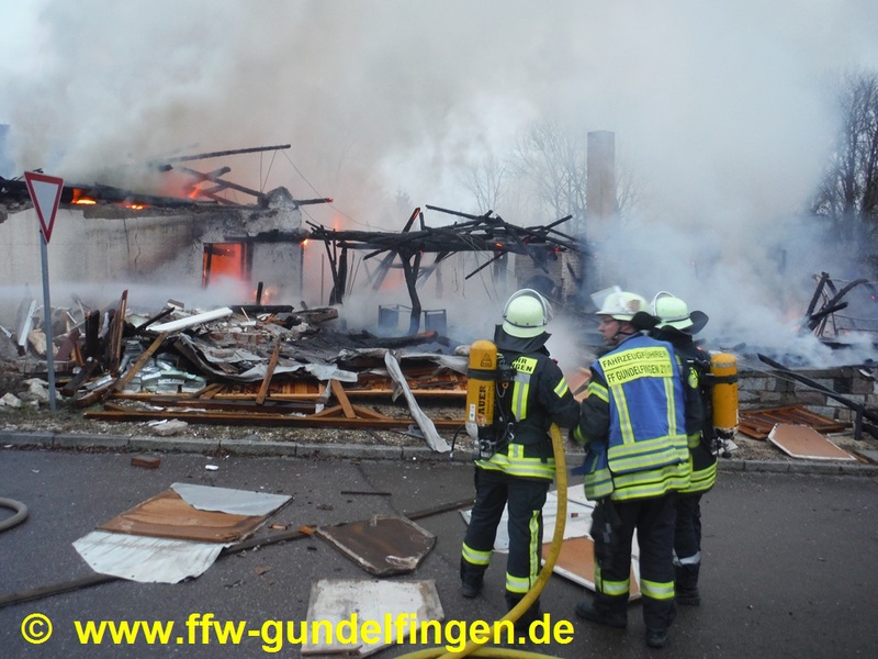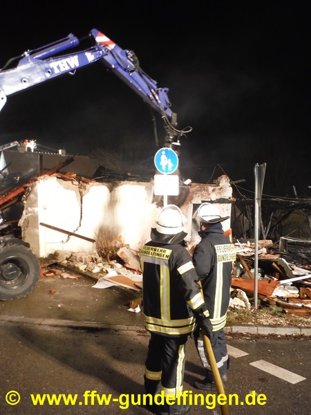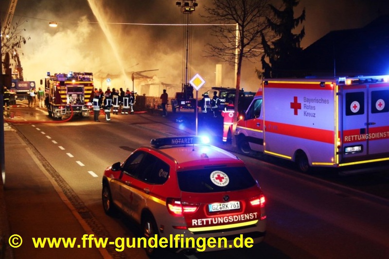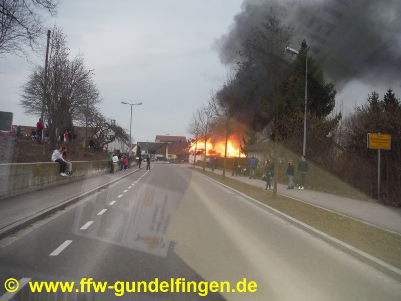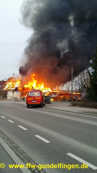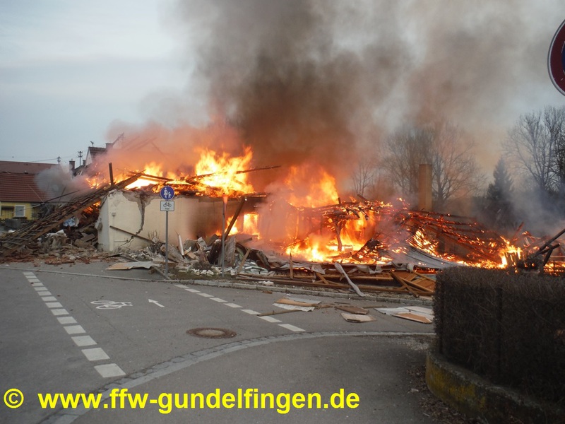 Kurz nach 17.30 Uhr gingen am Dienstag, 10.03.2015 Notrufe bei der Integrierten Leitstelle Augsburg ein. Für die Feuerwehren der Stadt Gundelfingen wurde um 17:38 Uhr Vollalarm ausgelöst. Beim Eintreffen der ersten Einsatzkräfte stand das Gebäude schon komplett in Flammen und die Straße war von herausgeschleuderten Dachziegeln und Trümmern der Fassade übersät. Das nachfolgende Großaufgebot an Rettungs- und Einsatzkräften konnte aufgrund der über der Einsatzstelle stehenden hohen Rauchwolke “auf Sicht” anfahren. Zu diesem Zeitpunkt war die Schadensursache noch unklar. Ersten Einsatzinformationen zufolge sollten in dem zirka 20 mal 15 Meter großen Komplex viele Gasflaschen lagern – was sich aber glücklicherweise als nicht nachweisbar herausstellte. Des Weiteren wird in dem brennenden Gebäude die Hausbesitzerin vermutet.
