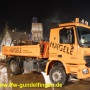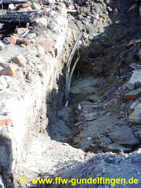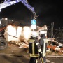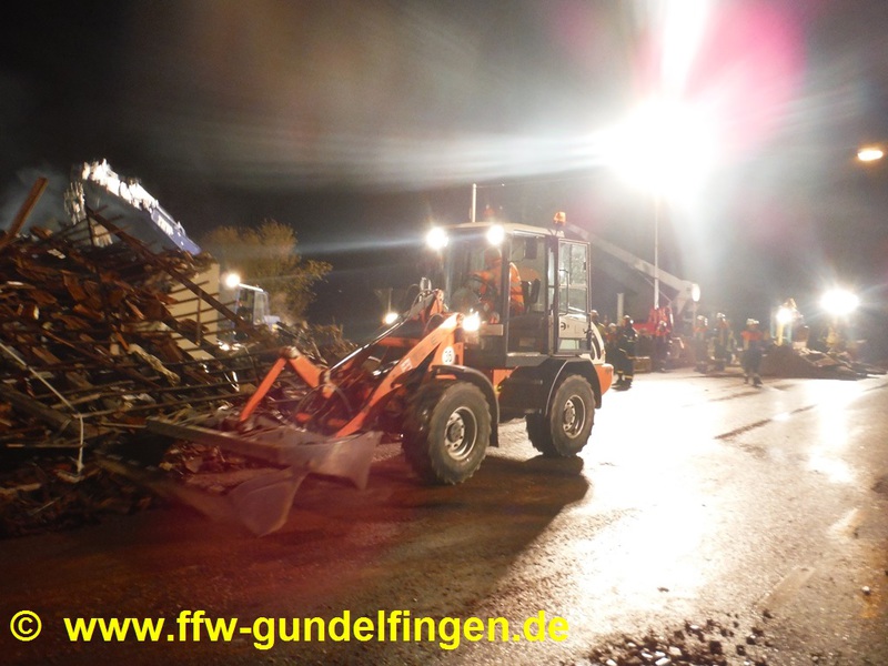Nachdem an der Einsatzstelle weiterhin eine Gaskonzentration gemessen werden konnte, wurde an einigen Stellen im Gehwegbereich nach der Gasleitung gebaggert – um das Austreten von weiterem Gas stoppen zu können. Nachdem dies vollzogen war, konnten die letzten Brandherde abgelöscht werden und mit der Suche nach der Vermissten in dem völlig zerstörten Haus begonnen werden – dies erfolgte in enger Zusammenarbeit mit dem Baggerführer des THW - schichtweise wurden hierzu die Trümmer abgetragen. Ebenfalls war dazu der Radlader des städtischen Bauhofes eingesetzt, welcher zur Unterstützung der Bergungs- und Aufräumarbeiten angefordert wurde. Da die entfernten Trümmerteile aufgrund der räumlichen Begebenheiten nicht im Bereich der Schadensstelle deponiert werden konnten, wurden diese mit zwei Kippern zu einer nahegelegenen Lagerstelle transportiert. Hierdurch freigelegte Glutnester wurden in diesem Zuge mit den bereitgehaltenen C-Rohren abgelöscht. Um die Schadensstelle großflächig und blendfrei ausleuchten zu können waren Lichtmastanhänger und mehrere Stative mit Flutlichtstrahler sowie der Beleuchtungs-Unimog des THW eingesetzt.