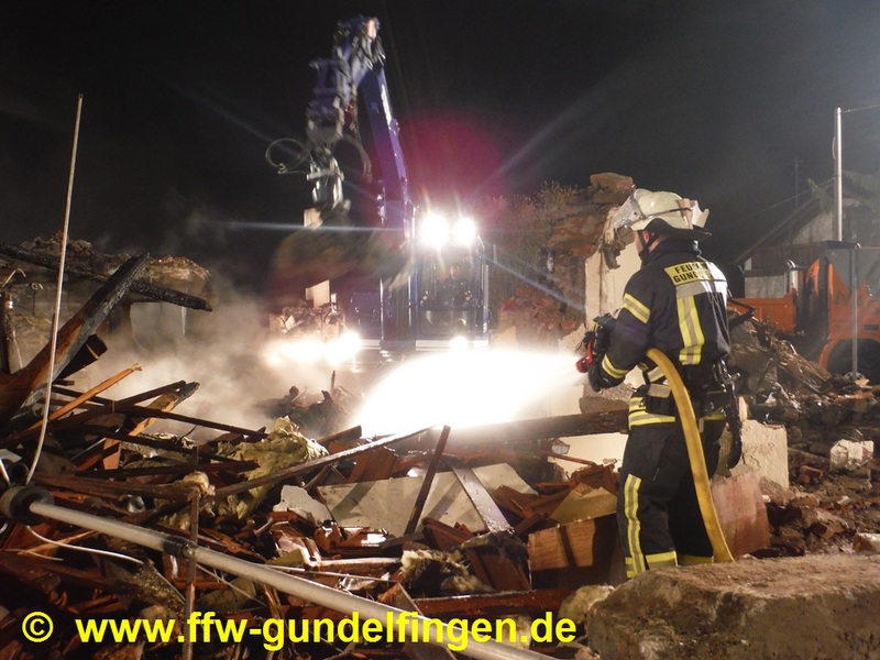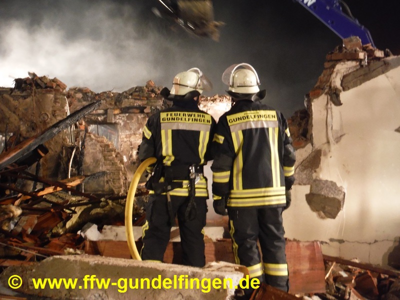 Im Gundelfinger Stadtteil Echenbrunn kam es in den Abendstunden des Dienstag, 10.03.2015 im ehemaligen „Bierstüble“ zu einer verheerenden Explosion. Zum Zeitpunkt des Unglücks befand sich das Eigentümerehepaar im Haus, im Obergeschoss hielt sich der 57-Jährige Ehemann und im Erdgeschoss seine 43-Jährige Gattin auf. Nach einer gewaltigen Detonation stand das Haus - samt Anbauten komplett in Flammen. Da die Hausmauern durch die Explosions-Stoßwelle nach außen gekippt waren, konnte der schwerverletzte 57-jährige Hausbesitzer durch engagierte Nachbarn über eine Leiter aus dem ersten Stock des brennenden Haus gerettet werden. Bis zum Eintreffen der Rettungskräfte betreuten sie ihn und versuchten, ihn zu beruhigen.