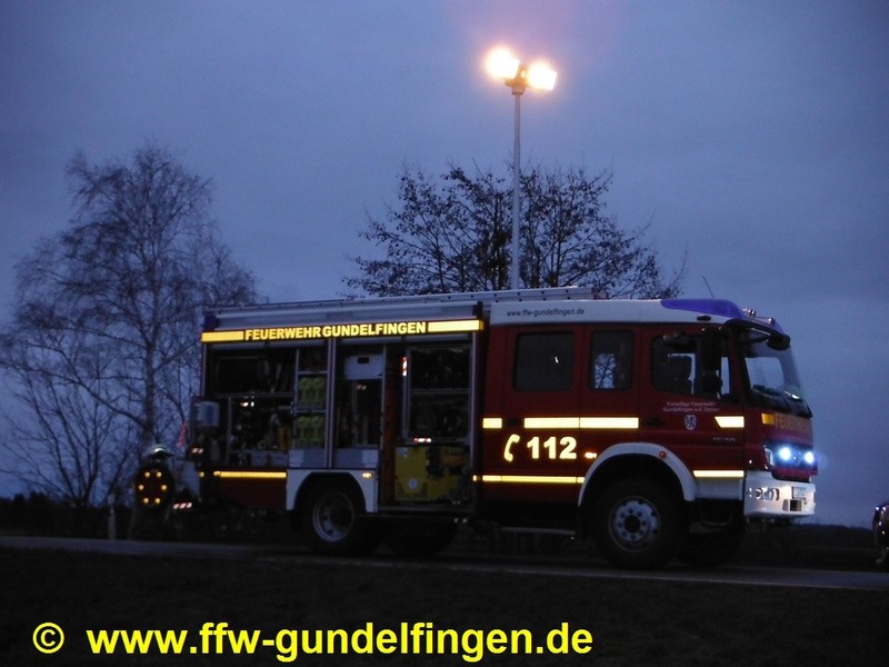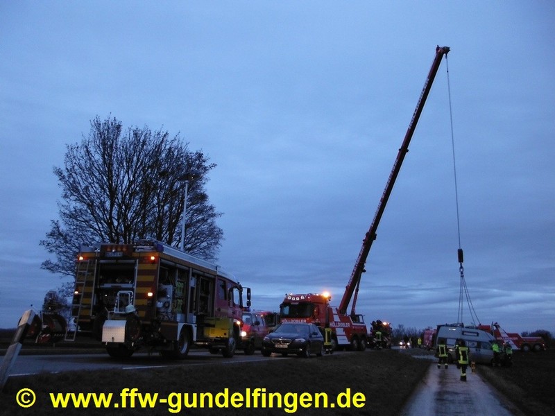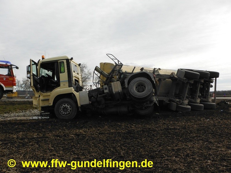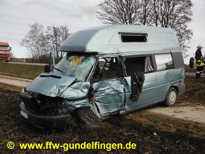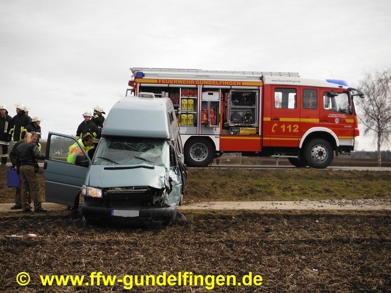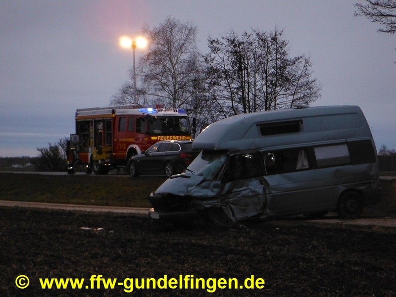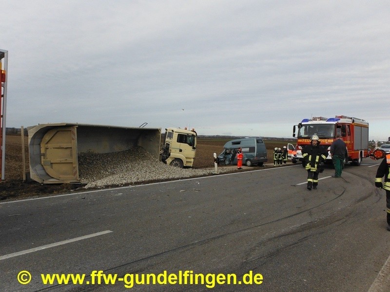 Nach Pressemeldung der Polizei kam es am Freitag (14.02.2014) kurz vor 14 Uhr zu einem schweren Verkehrsunfall auf der Bundesstraße B16 zwischen Anschlussstelle Gundelfingen-Süd und den Badeseen. Dabei wurde ein 73-Jähriger tödlich verletzt. Nach Polizeiangaben war der Mann mit seinem Kleinbus auf einem geteerten Feldweg in Richtung Bundesstraße unterwegs. Gleichzeitig befuhr ein 45-jähriger LKW Fahrer unterdessen die B16 von Günzburg kommend in Richtung Gundelfingen. Aus bislang unbekannter Ursache fuhr der 73 Jährige ungebremst auf die Fahrbahn der B 16. Es kam trotz Ausweichmanöver des Lkw-Fahrers zum Zusammenstoß der beiden Fahrzeuge. Der Pkw-Fahrer wurde im Fahrzeug eingeklemmt und starb noch an der Unfallstelle. Der Lkw-Fahrer wurde leicht verletzt und erlitt einen Schock, an beiden Fahrzeugen entstand Totalschaden. Der mit Kies beladene Auflieger des LKW-Gespannes kippte beim Zusammenstoß der Fahrzeuge zur Seite. Aufgrund des gemeldeten Unfallbildes mit LKW-Beteiligung wurde vorsorglich ein dritter Rettungssatz der Feuerwehr Lauingen mitalarmiert; nach Lageerkundung konnte die FFL den jedoch Einsatz auf der Anfahrt abbrechen.