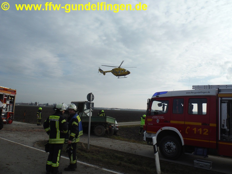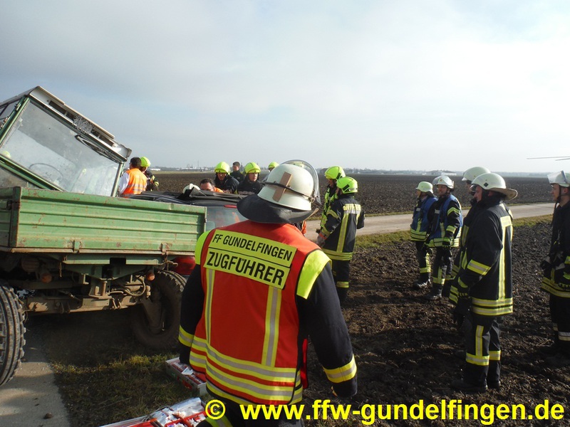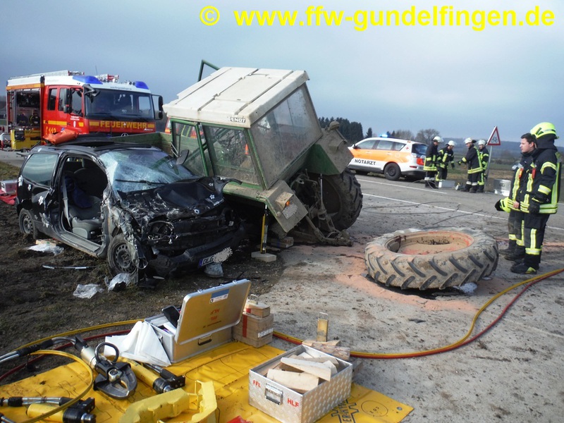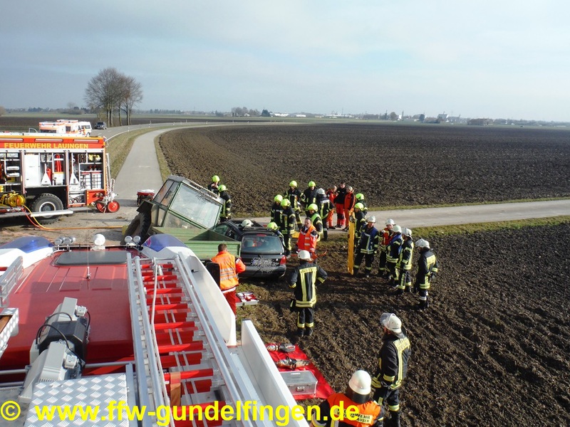 Nach DZ-Pressemeldung sind bei einem Unfall zwischen Lauingen und Veitriedhausen am Montagnachmittag, 19.01.2015 zwei junge Frauen leicht verletzt worden. Ein 18-Jähriger war um 13.20 Uhr mit seinem Traktor auf der Staatsstraße 2025 von Lauingen Richtung Veitriedhausen unterwegs. 500 Meter vor dem Ort wollte er nach links in einen Feldweg abbiegen. Im gleichen Moment setzte eine 19-jährige Autofahrerin zum Überholen an. Sie konnte nicht mehr rechtzeitig bremsen und prallte mit ihrem Kleinwagen frontal in die linke hintere Seite des Traktors. Durch den Aufprall brach die Hinterachse des Traktors, der dadurch das linke Hinterrad verlor. Wie die Polizei weiter mitteilt, wurden durch den Zusammenstoß beide Fahrzeuge nach links an den Fahrbahnrand und einen angrenzenden Acker geschleudert. Dort blieben sie ineinander gekeilt stehen. Der 18-jährige Traktorfahrer blieb unverletzt. Er begab sich vorsorglich zur Untersuchung ins Krankenhaus. Die 19-Jährige und ihre 18-jährige Beifahrerin waren in dem total beschädigten Kleinwagen eingeklemmt und mussten von der Feuerwehr aus dem Fahrzeug befreit werden. Sie zogen sich leichte Verletzungen zu, und wurden vorsorglich zur Behandlung in die Krankenhäuser nach Dillingen und Günzburg gebracht. Der entstandene Schaden beläuft sich auf insgesamt rund 15.000 Euro. Am Unfallort waren die Feuerwehren aus Lauingen, Veitriedhausen, Haunsheim, Unterbechingen und Gundelfingen im Einsatz. An der Unfallstelle mussten wegen auslaufendem Öl mehrere Kubik Erdreich ausgebaggert und entsorgt werden. Die Staatsstraße war ca. dreieinhalb Stunden gesperrt.