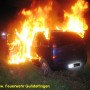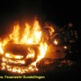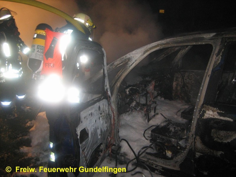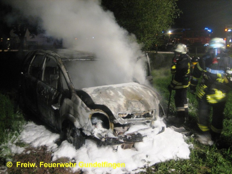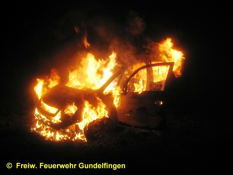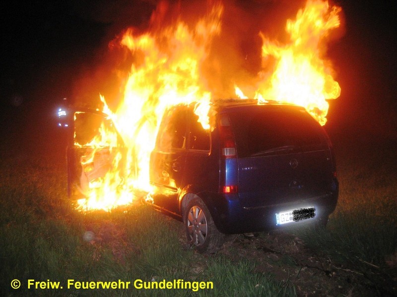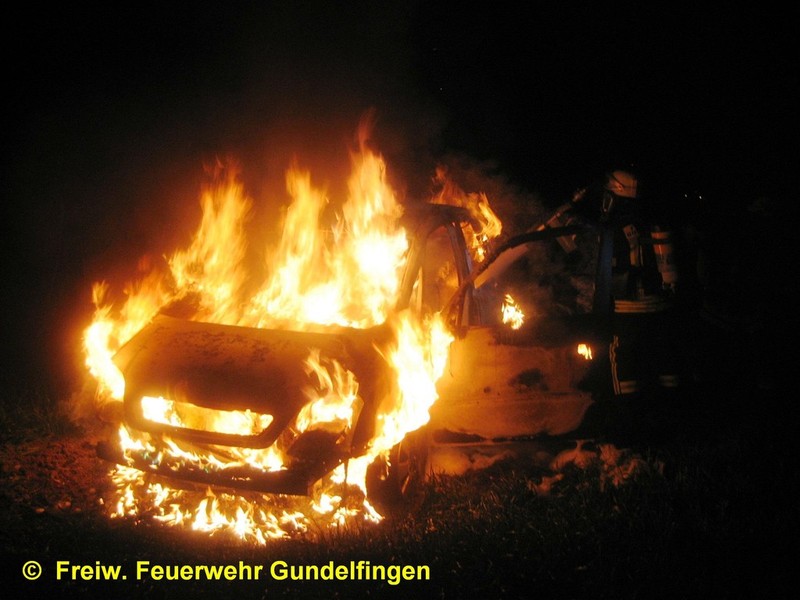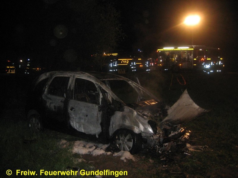 Zusammen mit der FF Peterswörth wurde die Freiwillige Feuerwehr Gundelfingen in der Nacht zum Ostersamstag, 23.04.2011 gegen 01.13 Uhr zu einem PKW-Brand am Ortsende von Peterswörth alarmiert. Nach ersten polizeilichen Ermittlungen für ein 19-Jahriger PKW-Lenker in der Peterswörther Straße Richtung Offingen; vermutlich aufgrund nicht angepasster Geschwindigkeit verpasste er die Rechtskurve und fuhr mit seinem Fahrzeug geradeaus in den Grünstreifen. Glück im Unglück hatte der Fahrzeuglenker als er um haaresbreite zwischen Bäumen hindurchsteuerte, über einen Entwässerungsgraben schanzte und erst ca. 80 Meter von der Fahrbahn im Acker zum Stehen kam. Nahezu unverletzt konnte er dem Unfall-PKW entsteigen, ehe dieser in Flammen aufging. Unter Atemschutz löschte die Feuerwehr Gundelfingen den PKW-Brand mit Schaum ab. Zusammen mit der FF Peterswörth wurde die Einsatzstelle für die polizeiliche Ursachenermittlung ausgeleuchtet und abgesichert. Ebenso wurde das Abschlepp- bzw. Bergungsunternehmen während der Aufräum- und Bergungsarbeiten unterstützt. Der leichtverletzte Fahrer wurde zur ärztlichen Versorgung vom Rettungsdienst ins Krankenhaus verbracht. Einsatzende war ca. 2:45 Uhr.