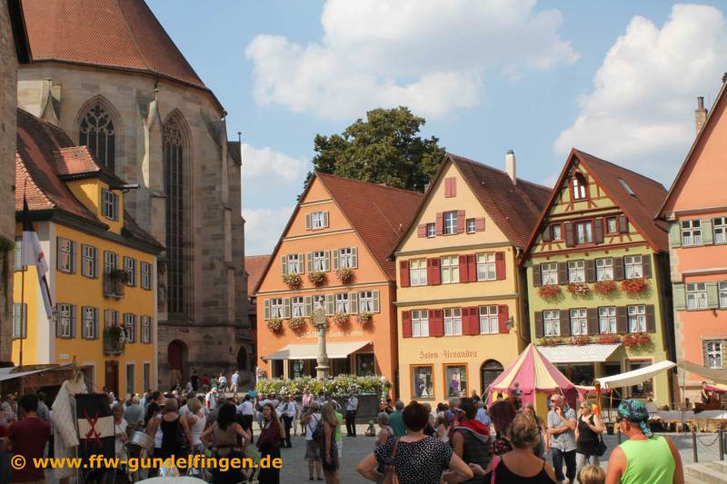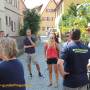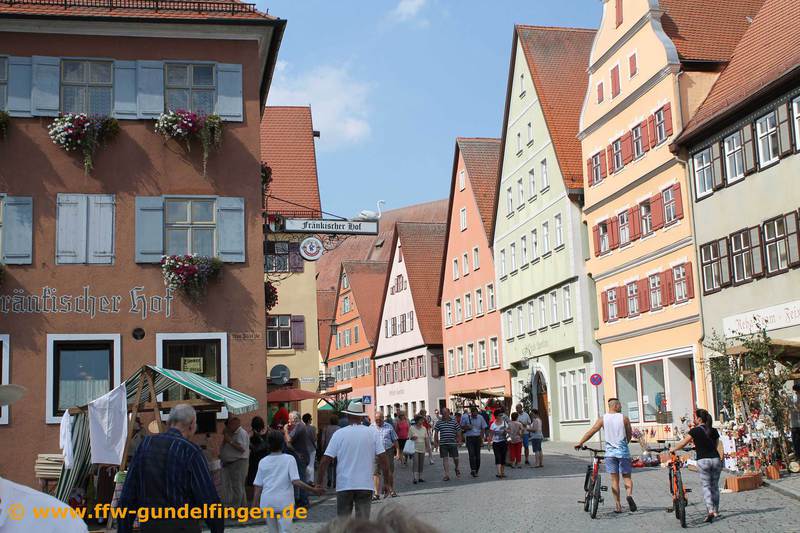 Nach der Verabschiedung bei Frank Kloos und einem kleinen Dankeschön, dass er sich die Zeit für uns genommen hat, ging es weiter in die Dinkelsbühler Altstadt, wo wir aufgeteilt in 2 Gruppen eine Stadtführung erhielten. Dabei konnten allerhand alte und wunderschöne Fachwerkhäuser bestaunt werden, mehrere alte Teile der Stadtmauer samt Tortürmen sowie das Münster und das alte Rathaus. Am Tag unseres Besuchs fand gleichzeitig auch das Altstadfest statt, bei dem man das Markttreiben des Mittelalters sowie verschiedene historische Gruppen bestaunen konnte.